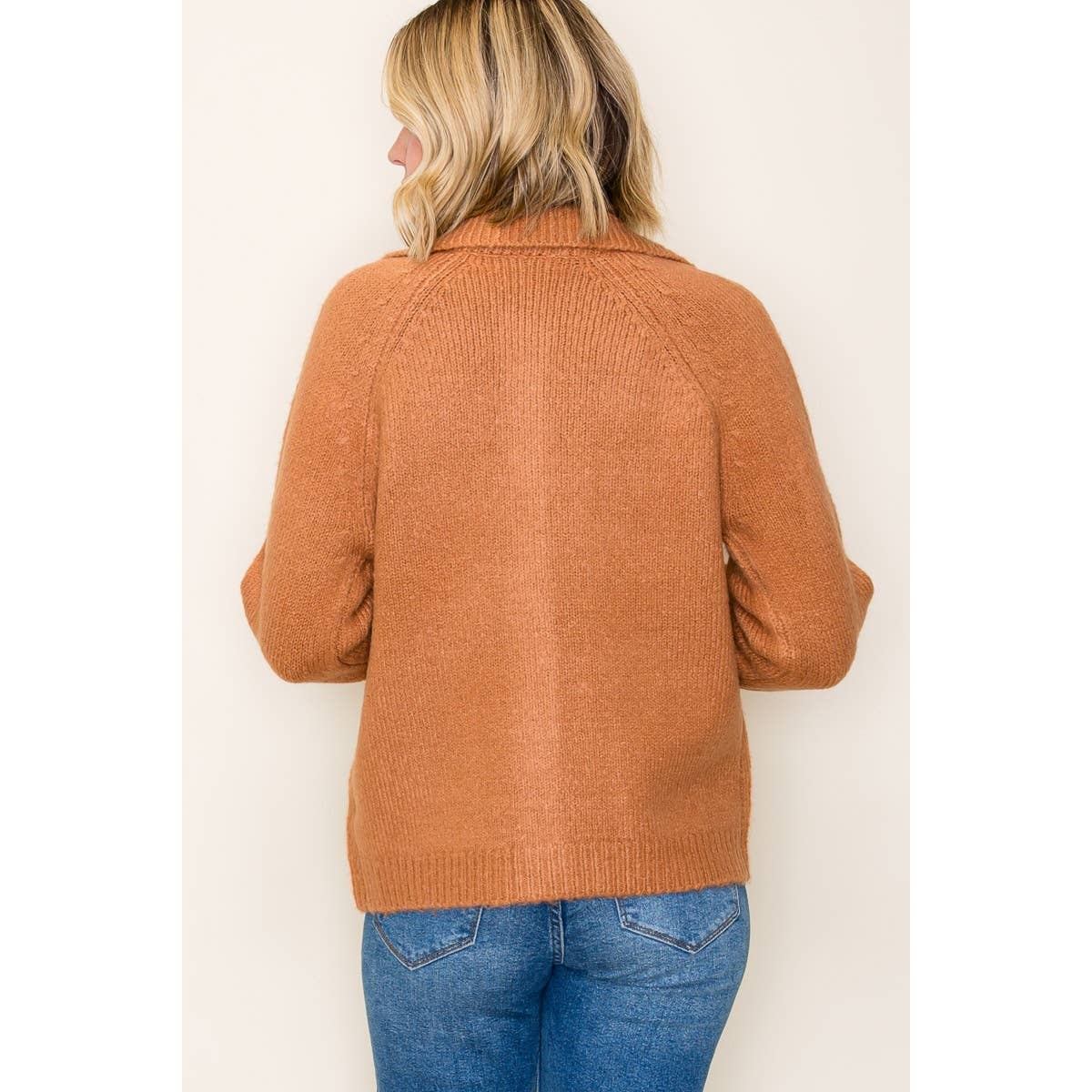 Layer up in style with this cozy collared sweater jacket featuring a full button-down front and roomy pockets perfect for your essentials. The chunky knit construction and long sleeves deliver serious warmth, while the rich camel hue pairs effortlessly with everything in your closet. Your new go-to piece for looking put-together without trying too hard.