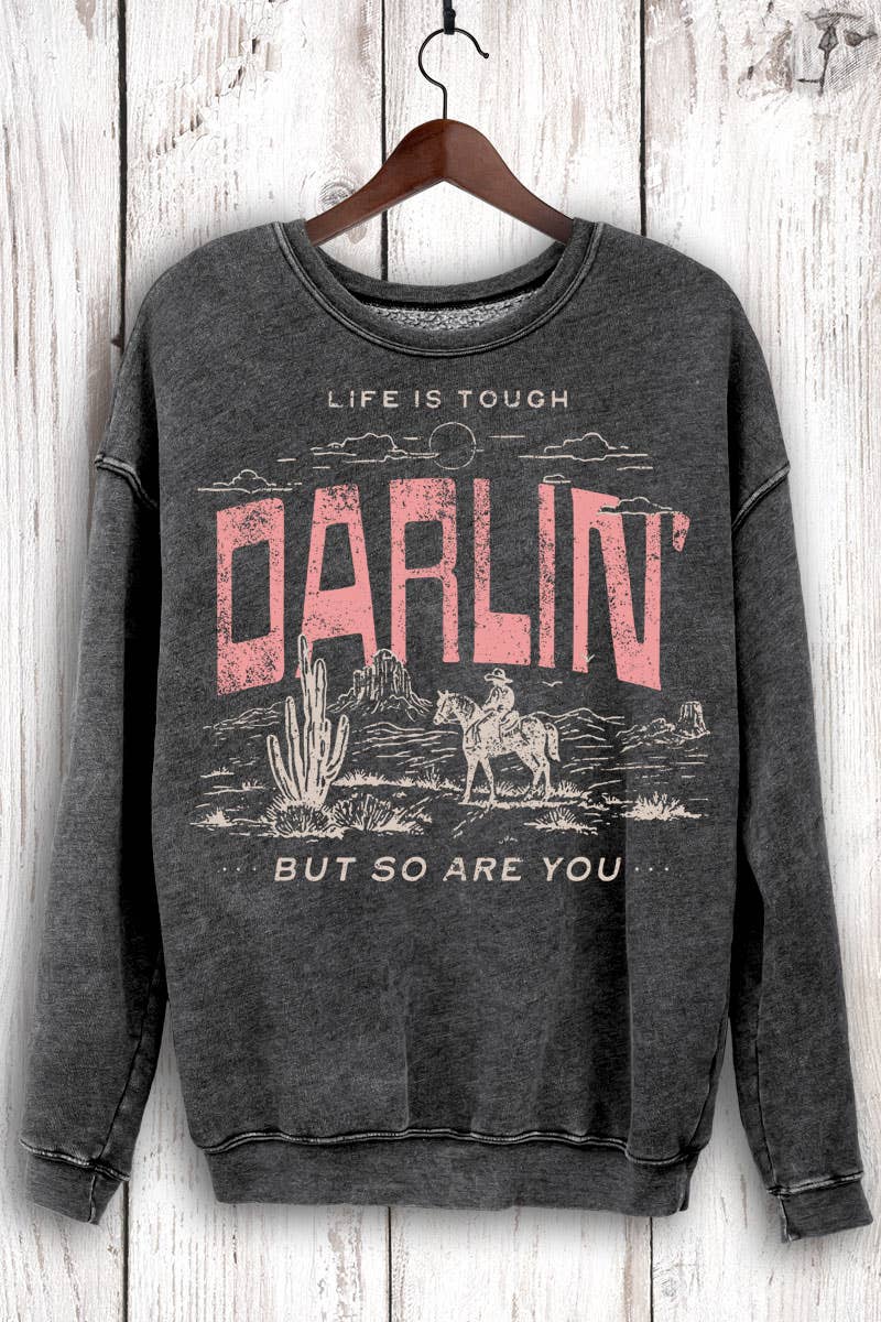 Rock that tough-as-nails attitude in this mineral-washed graphic sweatshirt. We've treated it with special enzymes and mineral washing to give it that perfectly worn-in vintage vibe without sacrificing comfort. The brushed fabric feels as good as it looks, making it your new go-to for days when life needs reminding that you're made of stronger stuff. Because darlin', you've got this.