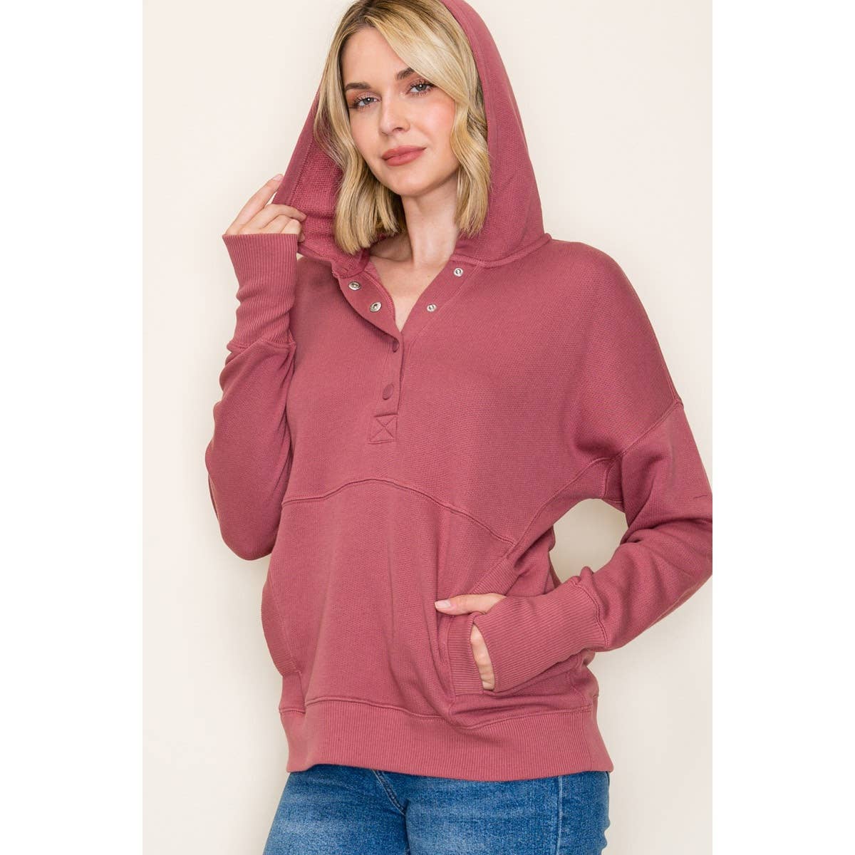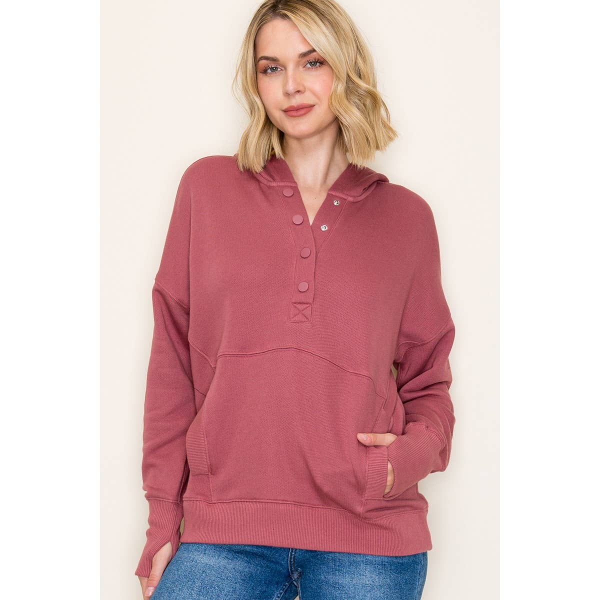 Slip into cozy comfort with this oversized marsala pullover hoodie—your new favorite layering piece. Featuring a convenient kangaroo pocket for your essentials, long sleeves for warmth, and a fun half snap button closure that lets you customize your vibe. Perfect for lounging, running errands, or just looking effortlessly cool.