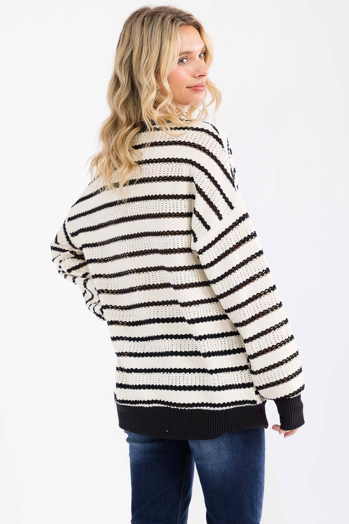 Cozy up with this Black Loose Fit Striped Sweater, designed for effortless style and comfort. Its playful striped knit pairs perfectly with a solid rib notched crew neck, while drop shoulders and a banded hem create a relaxed vibe. Long sleeves keep you warm without sacrificing that easygoing fit—perfect for layering or solo adventures on chillier days.