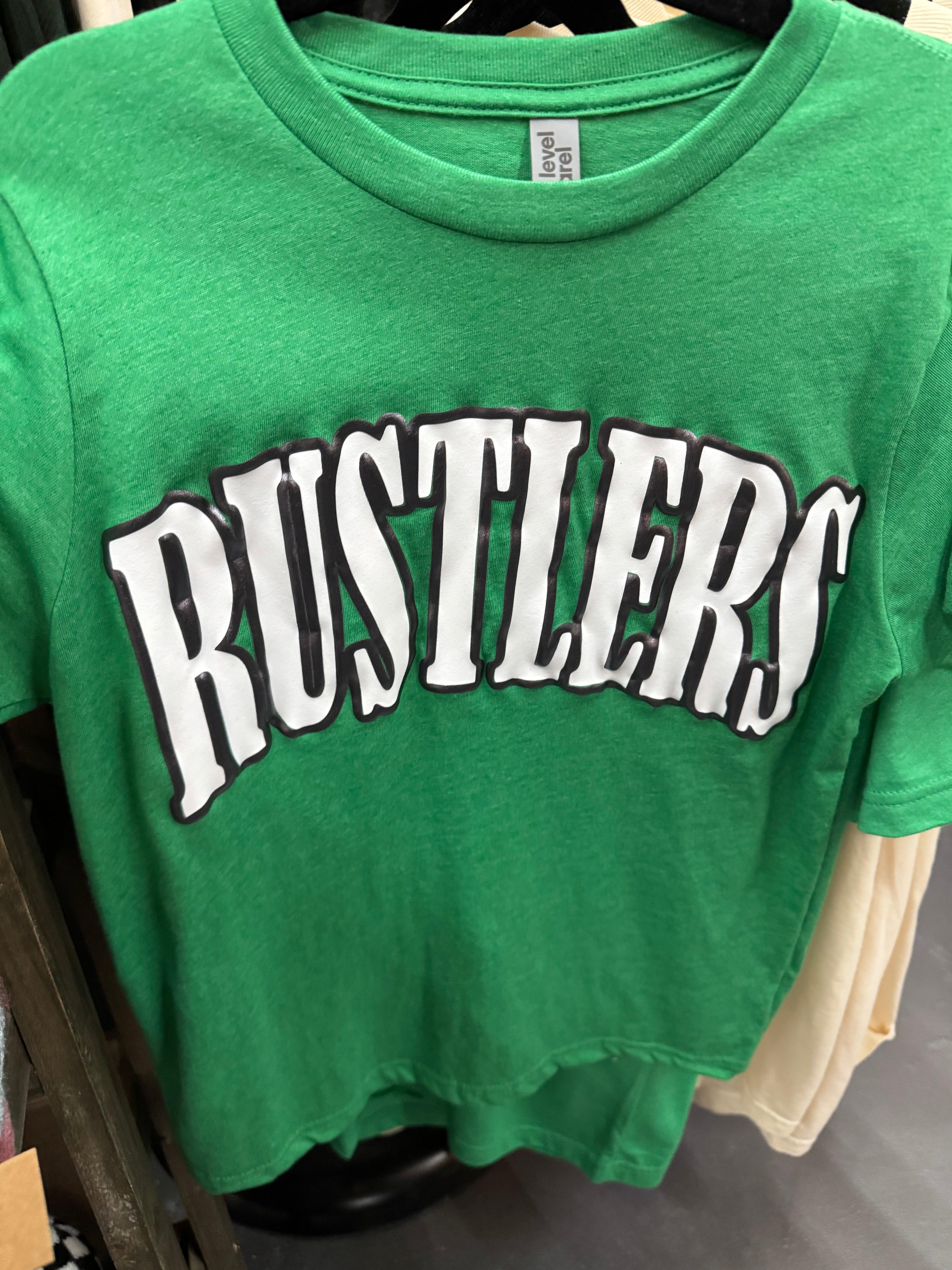 Bring some fun to your wardrobe with the Green Metallic Puff Rustlers Tee. Made from soft Bella Canvas fabric, this tee features a playful metallic puff print of the Rustlers mascot that adds a cool, textured shine. Perfect for showing team spirit or adding a pop of personality to your casual look!
