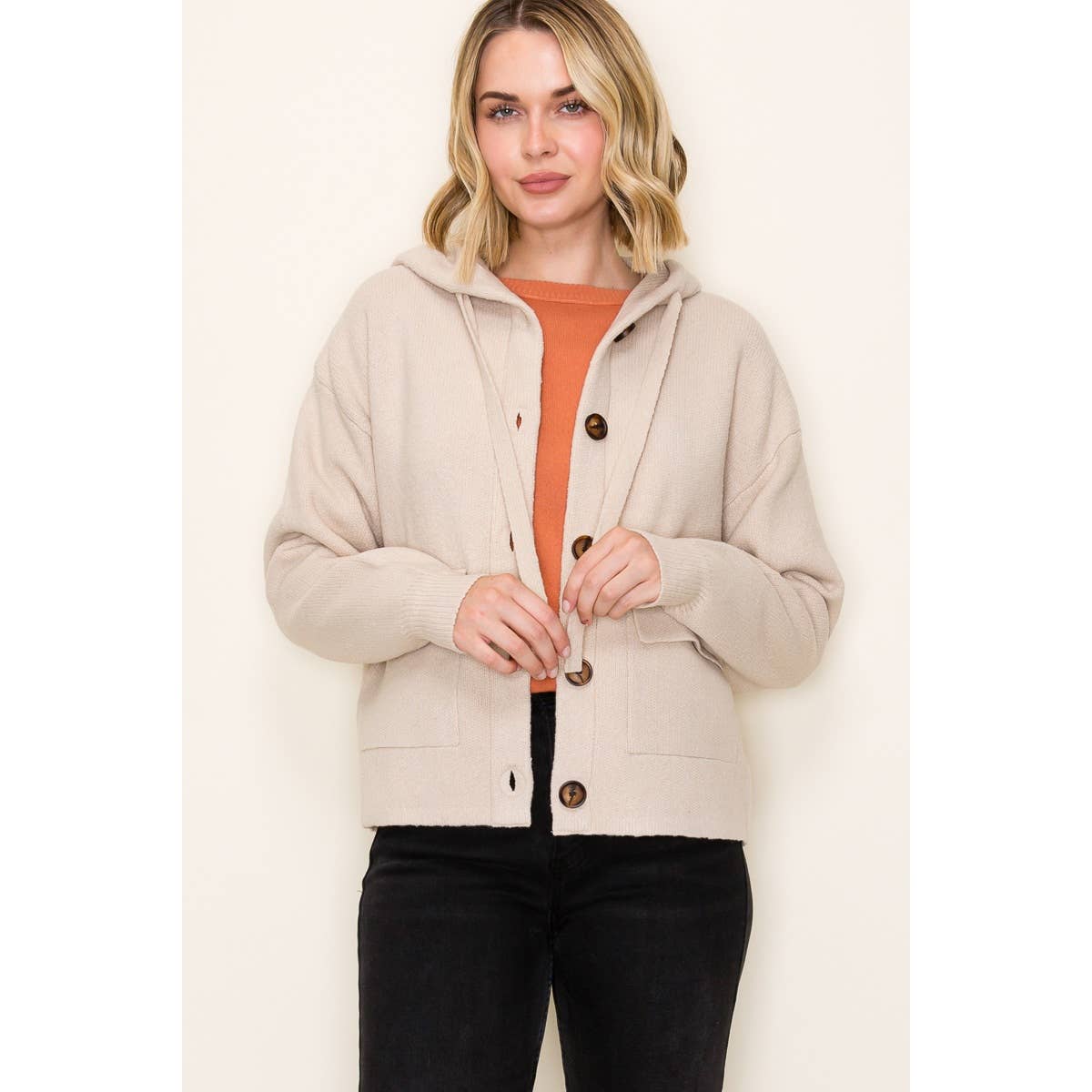 Stay cozy and stylish with this oatmeal button-down hoodie that's basically a hug you can wear. Featuring a drawstring hood, sturdy button closure, and long sleeves, this heavy sweater jacket keeps you warm through chilly days. Practical front pockets let you stash your essentials—or just your hands when you need them most. Perfect for layering or going solo, it's the laid-back piece your wardrobe has been craving.