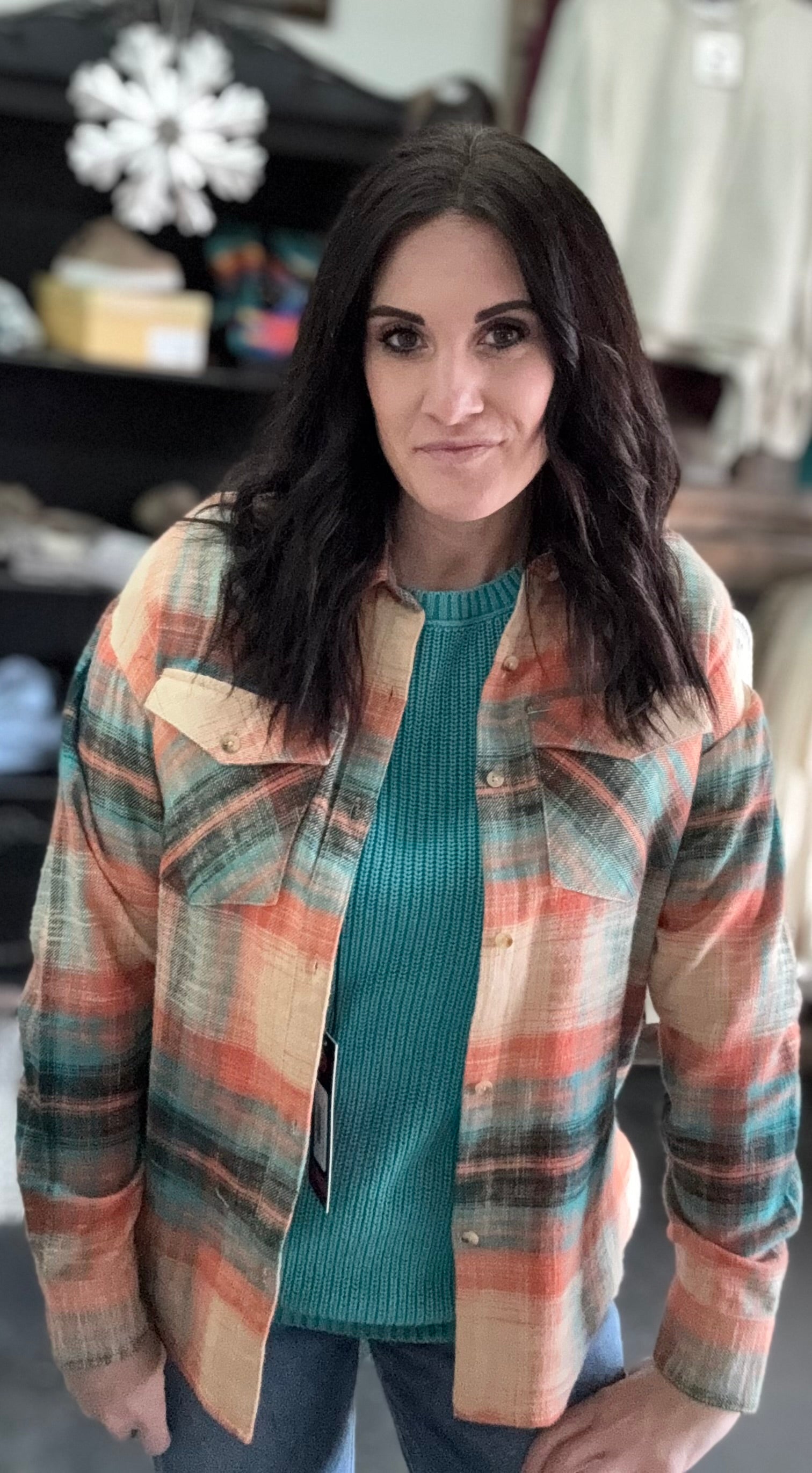 Wrap yourself in cozy comfort with this oversized flannel shirt featuring a gorgeous blend of teal and warm orange hues—perfect for capturing that fall aesthetic. Crafted from super soft flannel material, it's your new go-to layering piece that works whether you button it up for a polished look or wear it open and relaxed. Style it with our turquoise oversized sweater for an effortlessly cool seasonal vibe that'll have you ready for anything autumn throws your way.